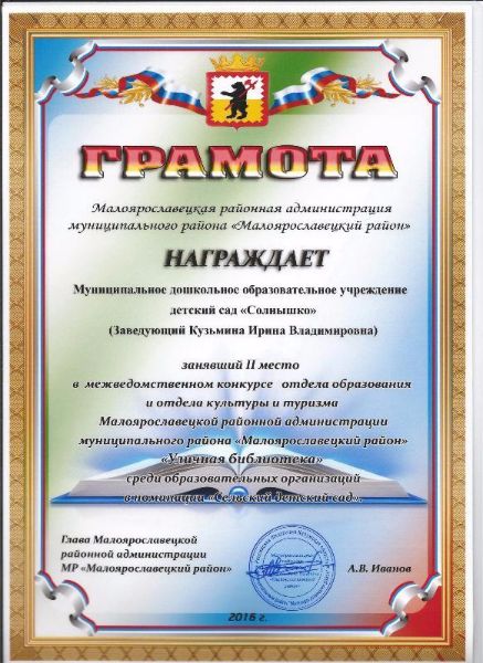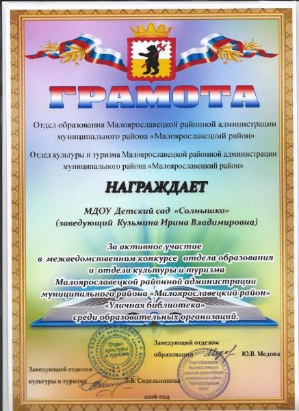 МДОУ детский сад «Солнышко» принимал участие в межведомственном конкурсе отдела образования и отдела культуры и туризма Малоярославецкой районной администрации муниципального района «Малоярославецкий район» «Уличная библиотека» среди образовательных организаций и занял почетное 2 место.